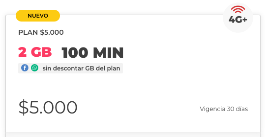 - Plan mensual $15.000 incluye 18GB (antes 14GB) + 400 minutos + Redes sociales y apps de música sin descontar GB.