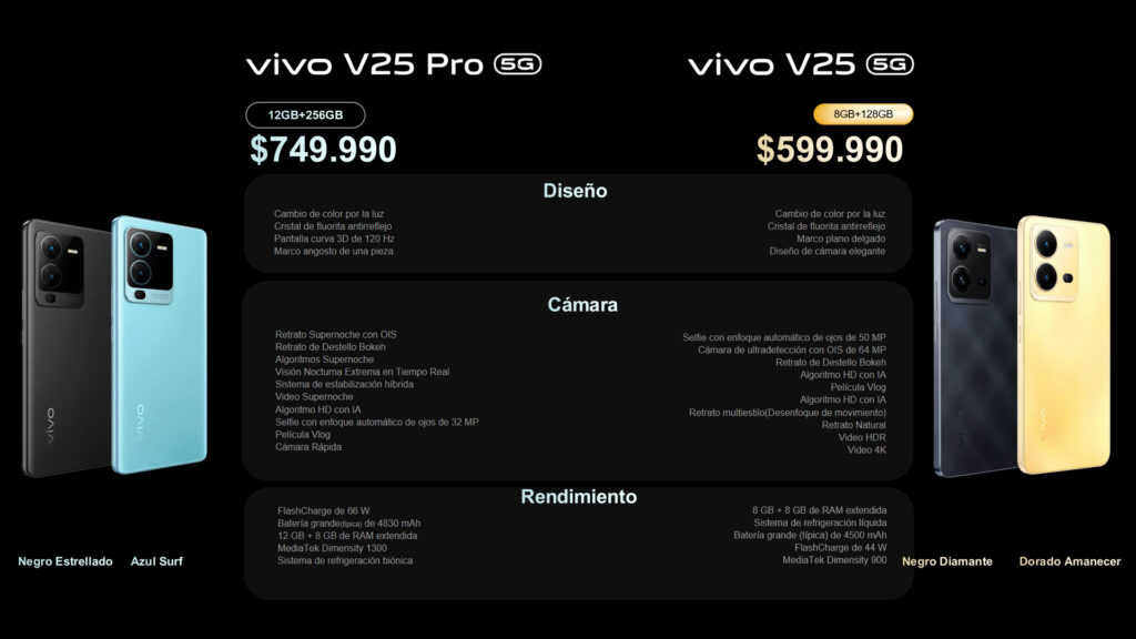En tanto, el V25 Pro viene en tonalidades Negro Estrellado y Azul Surf. Su precio queda en CLP 749.990.