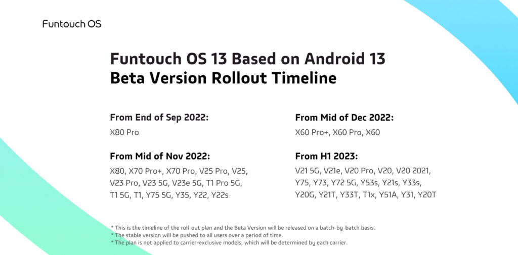 A mediados de diciembre de 2022 Android 13 arribará a los Vivo X60 Pro+, X60 Pro y X60. Durante el primer trimestre de 2023 lo hará en los Vivo V21 5G, V21e, V20 Pro, V20, V20 2021, Y75, Y73, Y72 5G, Y53s, Y21s, Y33s, Y20G, Y21T, Y33T, T1x, T51A, Y31 y el modelo Y20T.