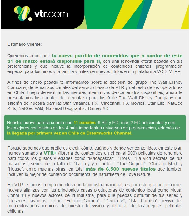 El operador VTR ha comenzado a comunicar por medio de un email a sus clientes que tengan contratado el servicio de televisión, ya que muy pronto saldrán 9 canales que serán reemplazados por nuevas señales.