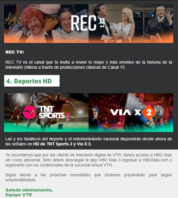 Además, como verás en la imagen superior, VTR anuncia que sus clientes ahora tendrán disponible las señales en HD de TNT Sports 3 y Via X 2.