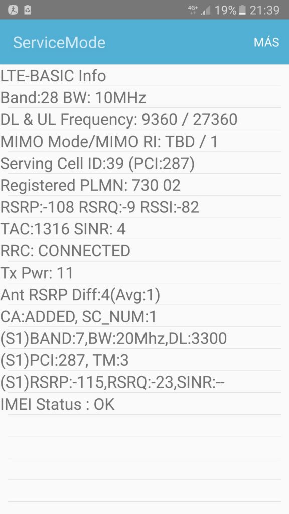 Como verás en la captura, el análisis que muestra su Samsung Galaxy S7 al marcar el *#0011# indica que se encuentra conectado a la red 730 02 (Movistar Chile) y conectado a la banda 28 (700MHz) y más abajo aparece la banda 7 (2600MHz), así que en teoría la información calza perfectamente con Carrier Aggregation (4G+).