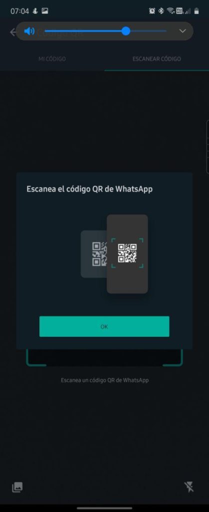 Si en esa misma pantalla te deslizas hacia la izquierda, te vas a encontrar con el lector de códigos QR que te servirá cuando otra persona te muestra o comparte su código QR y así puedas escanearlo para registrar su contacto de manera rápida.