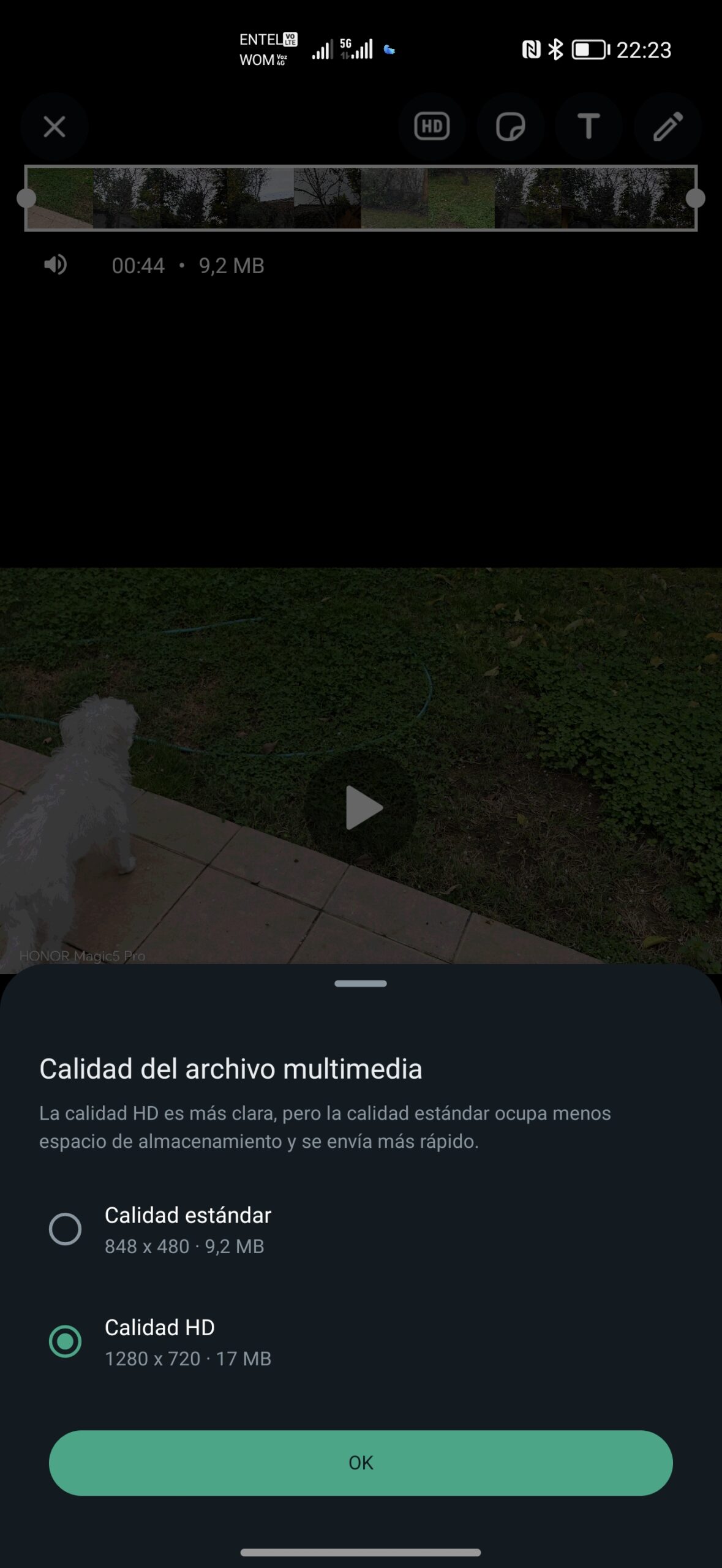 Para usar esta función, las instrucciones son las mismas que las imágenes. Solo debes abrir un archivo, presionar sobre el botón “HD” en la parte superior y la app te permitirá elegir entre “Calidad estándar” y “Calidad HD”, obviamente tú eliges la última opción.