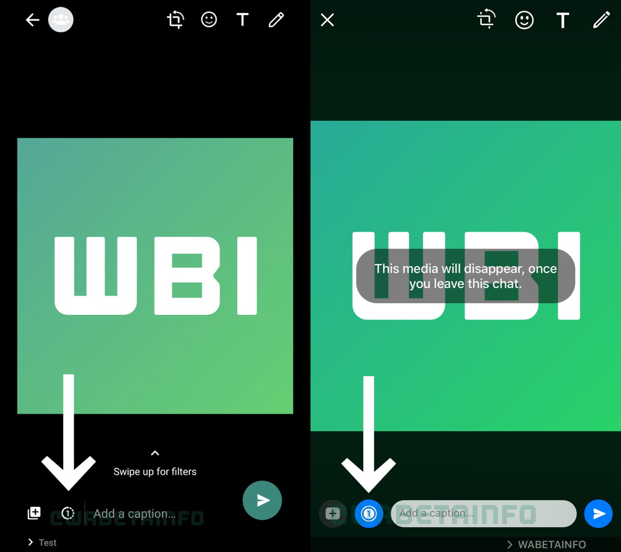 La opción aparecerá en el editor de imágenes que aparece al momento de elegir una imagen para enviar. Ahí te aparecerá un botón con un “1” que significa que las imágenes que enviemos solo podrán ser visualizadas una sola vez.