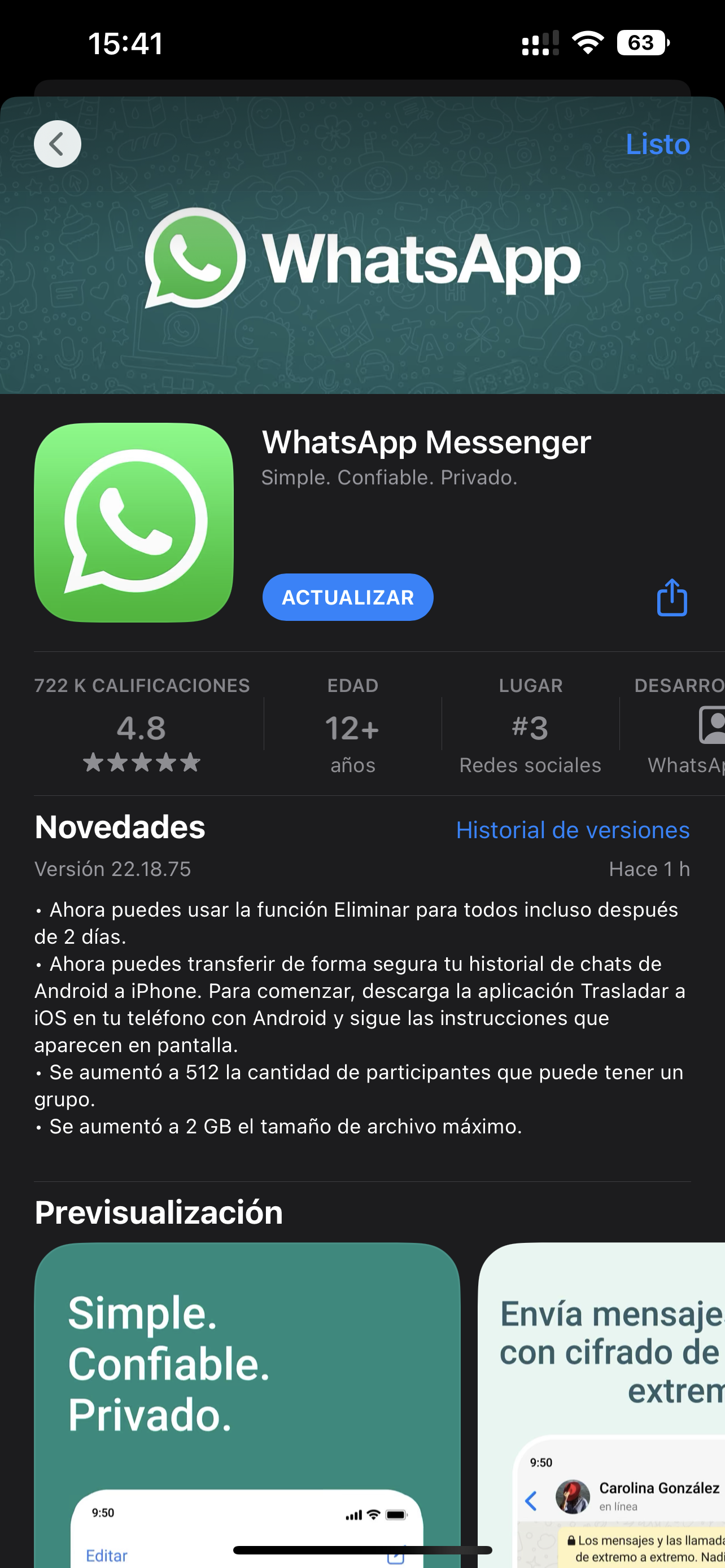 Tal y como se ve en la imagen, solo tienes que ir a la App Store, seleccionar el botón de tu perfil y actualizar la aplicación de WhatsApp para que puedas usar esta mejorada función. Recuerda, son 2 días y 24 horas para poder eliminar el o los mensajes.