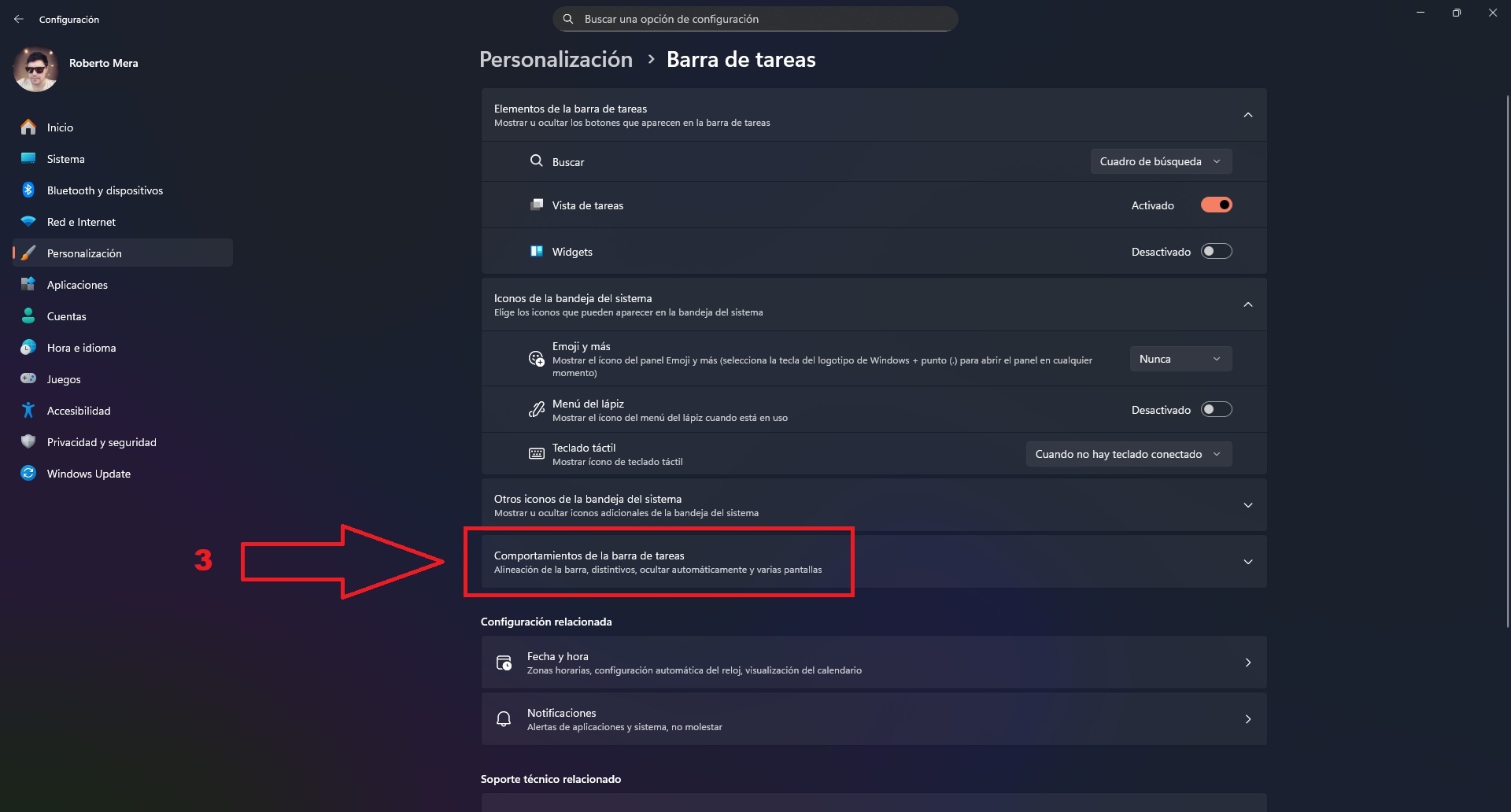 Posteriormente, vamos al apartado «Barra de tareas», después vamos a «Comportamiento de la barra de tareas».