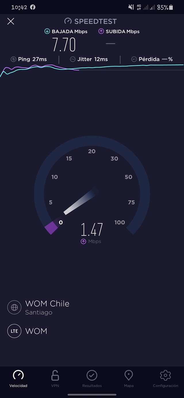 La prueba la realicé en la comuna de La Florida (cerca de Jardín Alto), y ahí recibía una señal muy débil, a penas una barrita de señal 4G. Sin embargo, al realizar un test de velocidad, logré sacar un poco más de 40 Mbps de velocidad de descarga.