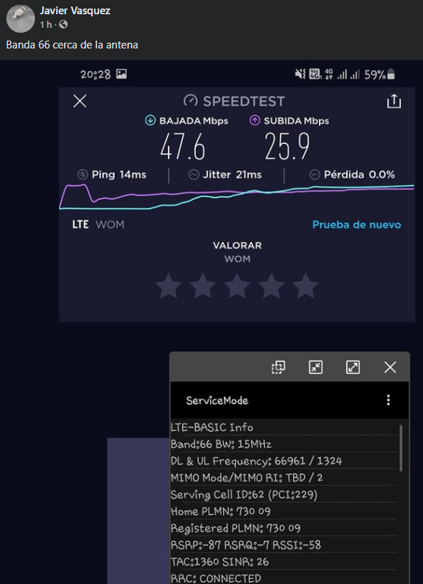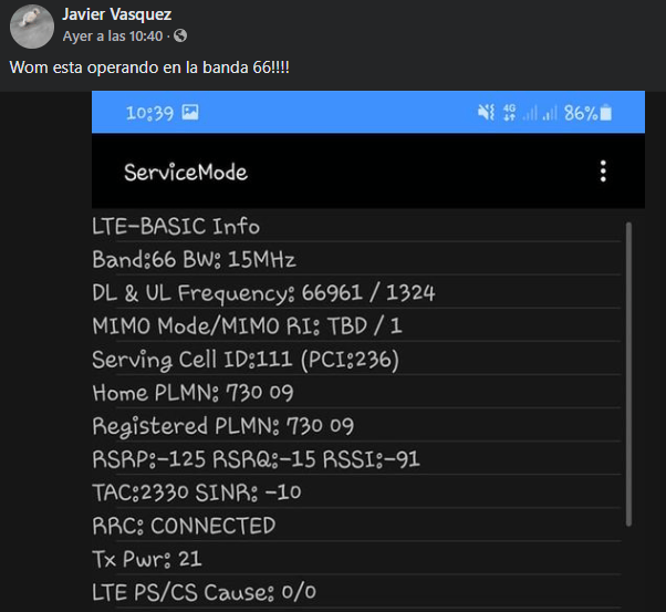 La noticia se inició en la comunidad Operadores CL en Facebook donde el usuario Javier Vásquez notó que su móvil Samsung Galaxy A50 estaba conectando a la banda B66 del operador WOM en la comuna de Padre Hurtado.