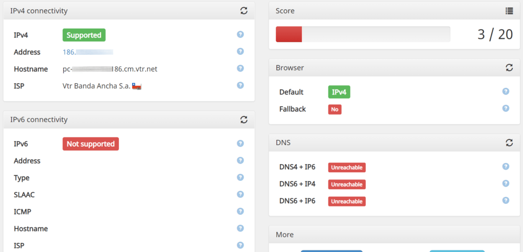 Así se ve la prueba en una red que no tiene IPv6 como el internet fijo del operador VTR: