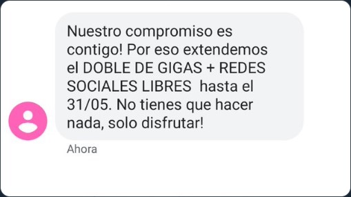 A través de un SMS y/o por medio de un email, el operador ha informado que podrán seguir usando el doble de gigas que se les aplicó a todos sus clientes postpago y bolsas de prepago durante todo el mes de mayo, ya que antes estaba programado para ser usado hasta hoy 30 de abril.
