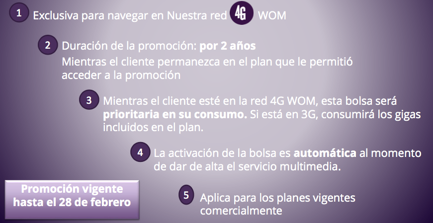 WOM aprovecha de informar también que el plan Extra Gigas ya no estará disponible para ser contratado a partir de ahora. La promoción «Doble de gigas por dos años» será válida solo hasta el 28 de febrero. WhatsApp ilimitado es válido solo para mensajes y llamadas de voz. No están incluidas videollamadas o funciones futuras. Funciona también en Roaming Nacional.