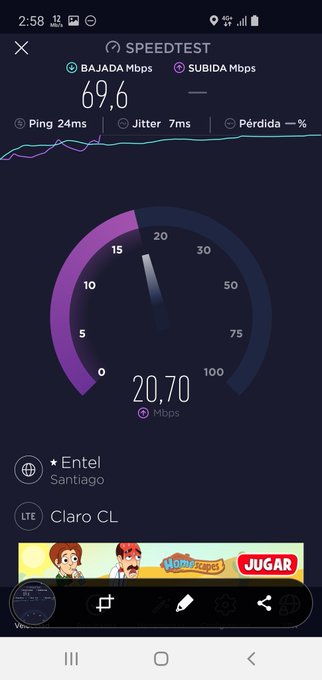 Nuestro lector también aprovechó de realizar una prueba de velocidad para ver si mejoraba la velocidad de la red 4G, y por lo que podemos apreciar anda bastante bien este 4G+ experimental: