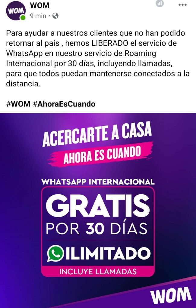 A través de redes sociales, nos hemos enterado de que WOM liberó el acceso a WhatsApp para todos aquellos que se encuentren en Roaming Internacional, y podrán hacerlo de manera ilimitada por 30 días, y obviamente de manera gratuita.