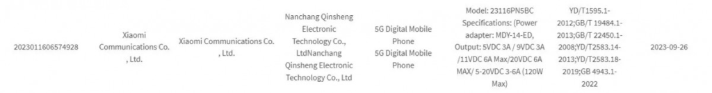 Y tal como ya podemos ver en la agencia certificadora 3C, el equipo con nombre clave 23116PN5BC ha sido certificado. Como gran novedad, podemos ver que el dispositivo soportará carga rápida de 120W de potencia vía cable. Este no sería otro que la versión Pro del Xiaomi 14.
