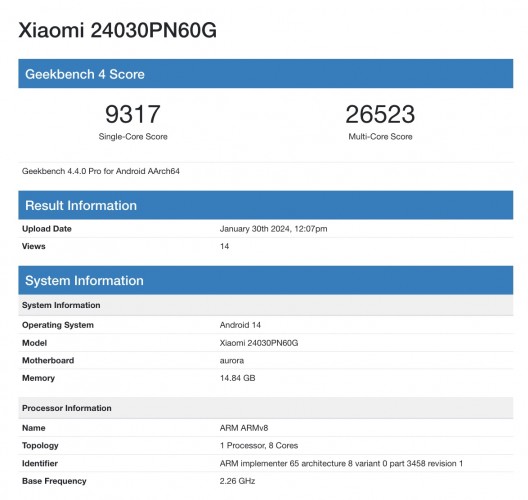Así, el Xiaomi 14 Ultra apareció con el número de modelo Xiaomi 24030PN60G y el nombre clave «aurora». El dispositivo obtuvo 9.317 puntos en la prueba de un solo núcleo y de 26.523 en la multi-núcleo. También se vuelve a confirmar que el dispositivo está equipado con el procesador Snapdragon 8 Gen 3 con una frecuencia base de 2,26 GHz.
