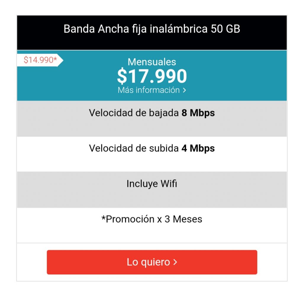 El servicio por ahora cuenta con dos planes disponibles y ambos cuentan con velocidades de 8Mbps de bajada y 4Mbps de subida, mientras que su cuota de navegación va desde los 50GB.