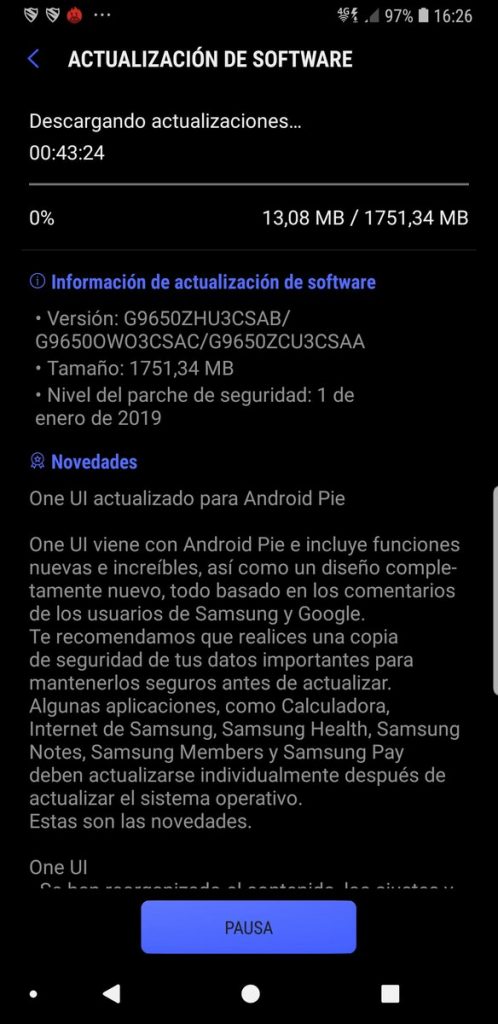 Nuestro lector en Twitter @PALOMOPCS fue uno de los primeros en avisarnos que su Samsung Galaxy S9+ adquirido de manera libre en Chile había recibido la OTA de Android 9 Pie, junto con la renovada interfaz One UI.