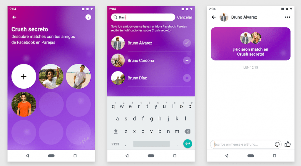 Si eliges Crush secreto, podrás seleccionar hasta nueve de tus amigos de Facebook. Si esas mismas personas están dentro de Facebook Parejas, recibirán una notificación diciendo que hay alguien interesado en ellas. Si dicha persona te agrega a su lista de «crushes secretos», se convertirá en un match.