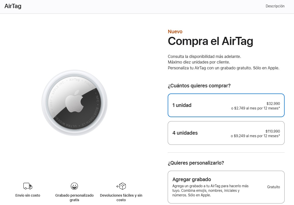 El nuevo AirTag de segunda generación tiene un precio de CLP $32.990 en Chile si compras una sola unidad. En tanto, si compras un pack de 4 unidades, tiene un precio de CLP $110.990. Esto se traduce en un precio de CLP $27.747 cada uno si compras el pack. Además, lo puedes grabar gratuitamente con la leyenda que tu elijas.