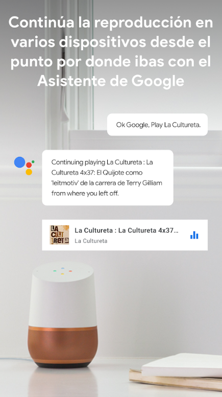 La compañía también busca que todos los podcasts estén sincronizados con todos tus dispositivos de Google. De esta manera podrás pedirle a Google Assistant que busque y también que reproduzca un posdcast en cualquier dispositivo que tengas conectado a tu cuenta de Google, como por ejemplo el Google Home, Chromecast… etc.