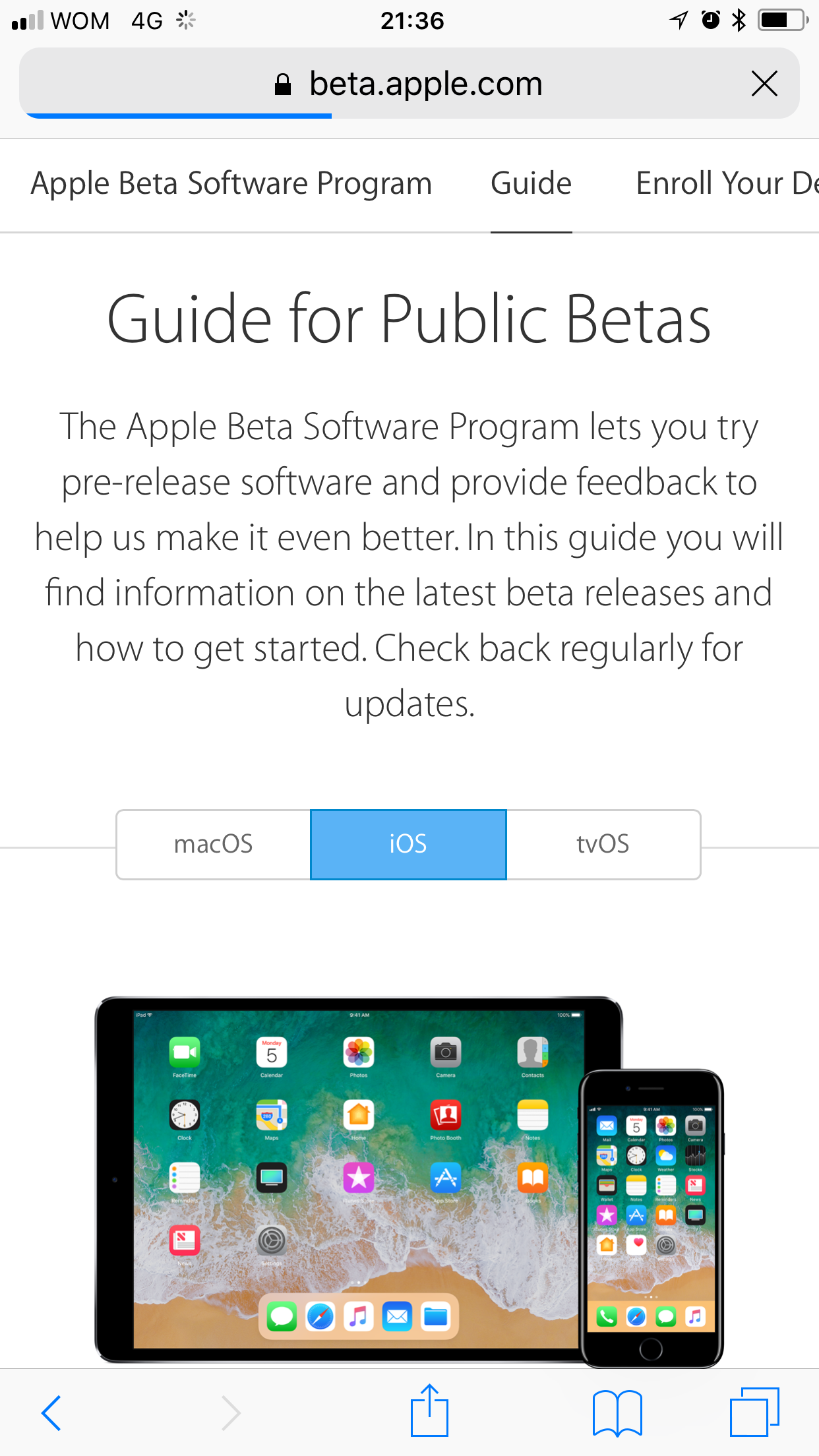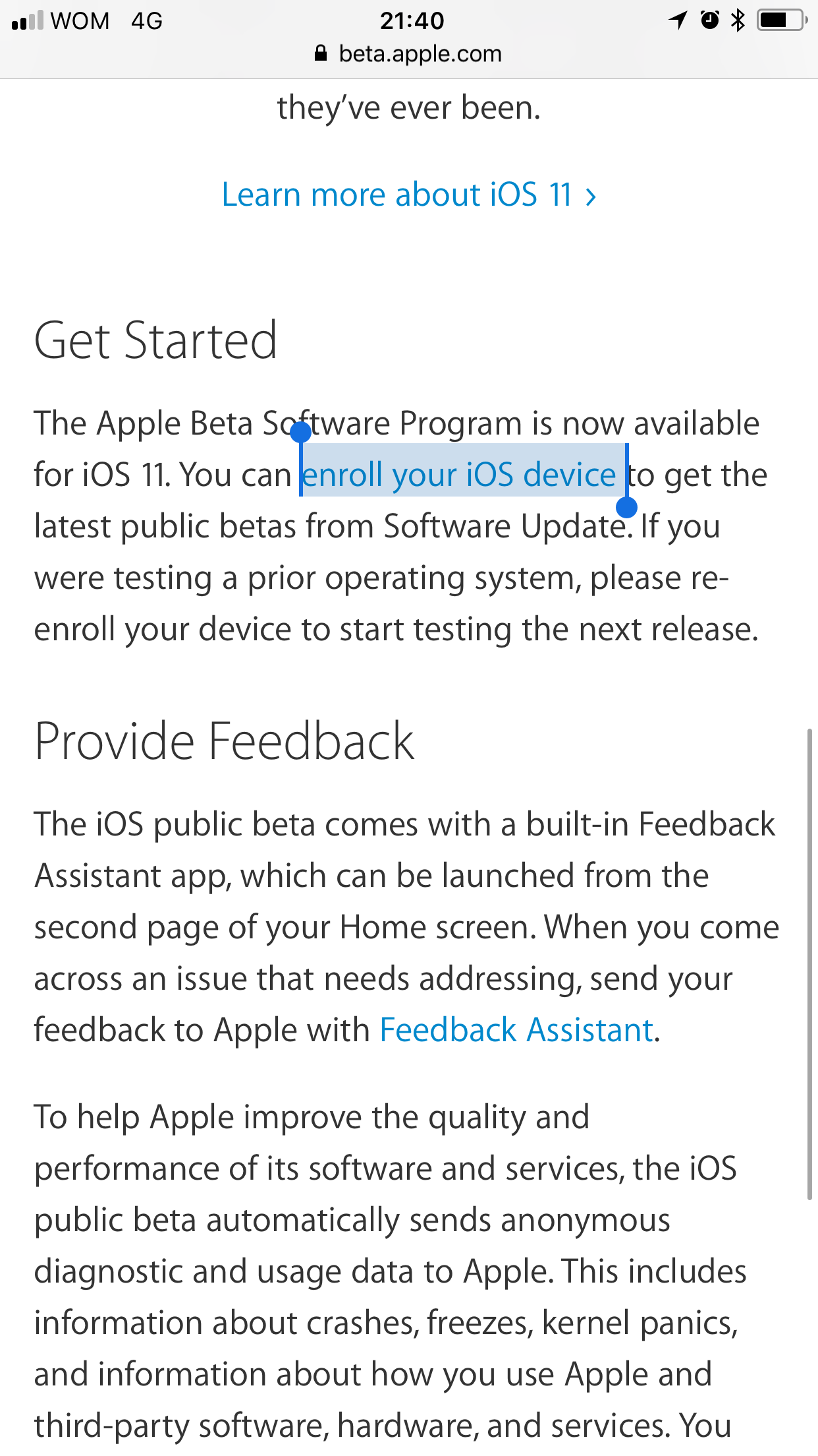 Te encontrarás con una pequeña introducción sobre las betas públicas de Apple. Desliza un poco hacia arriba y presta atención donde dice «Get Started», ya que en el texto de abajo deberás presionar donde dice «enroll your iOS device»…