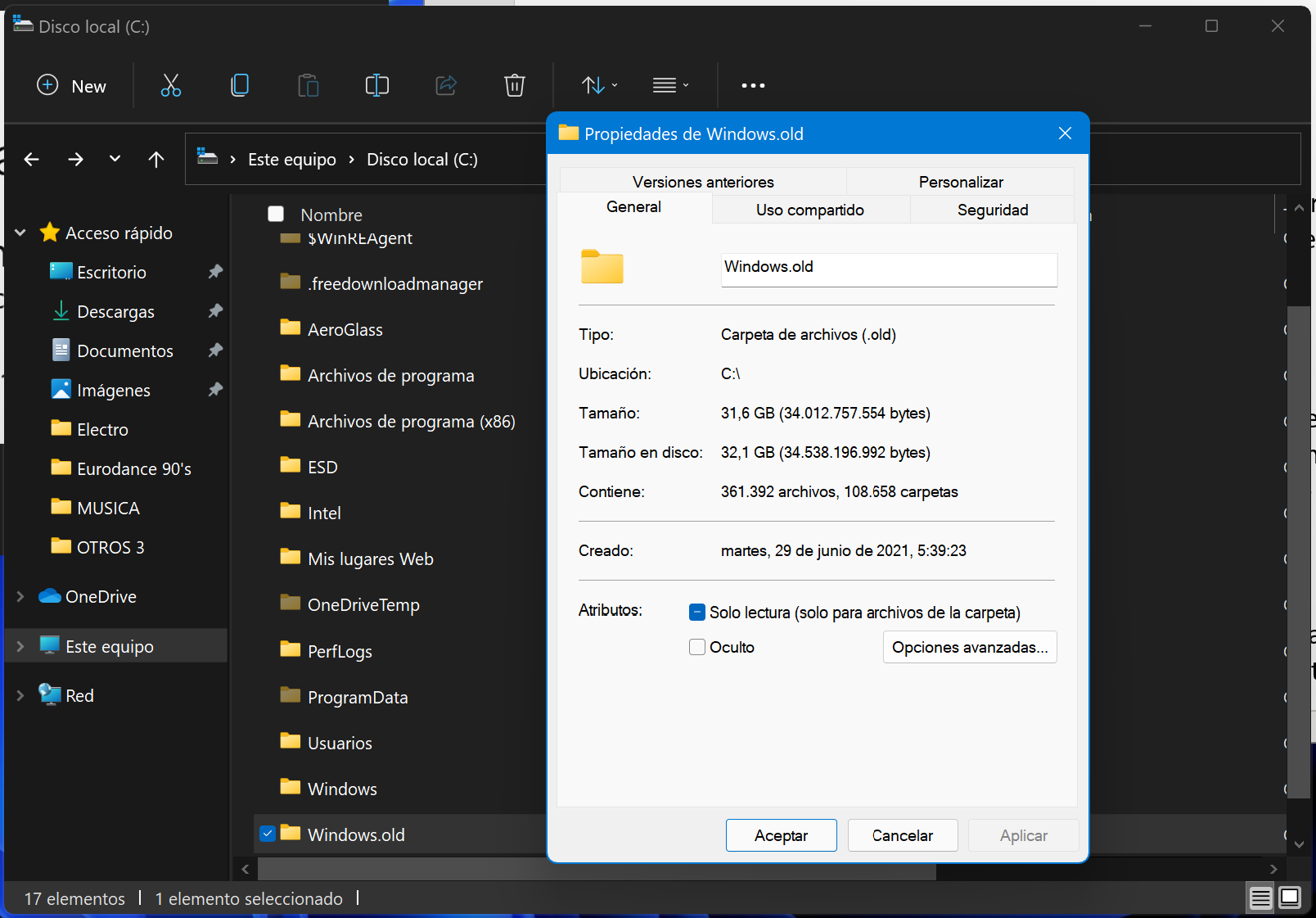 Desde ya te digo que podrás volver sin problemas, ya que al instalar esta versión de prueba de Windows 11, el sistema hace un backup completo de Windows 10 y lo guarda en la Unidad C con el nombre “Windows.old”. En mí caso, la carpeta terminó pesando 31 GB, por lo que es importante que tengas el espacio suficiente en la Unidad C.