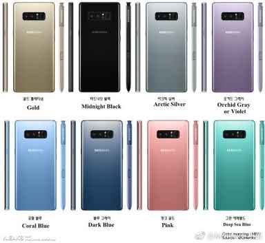 Sumado a esto, también se han filtrado todos los colores en los que estará disponible el nuevo phablet de Samsung, que serán nada mas y nada menos que ocho, y además, el S-Pen por primera vez llevará el color del dispositivo asociado.