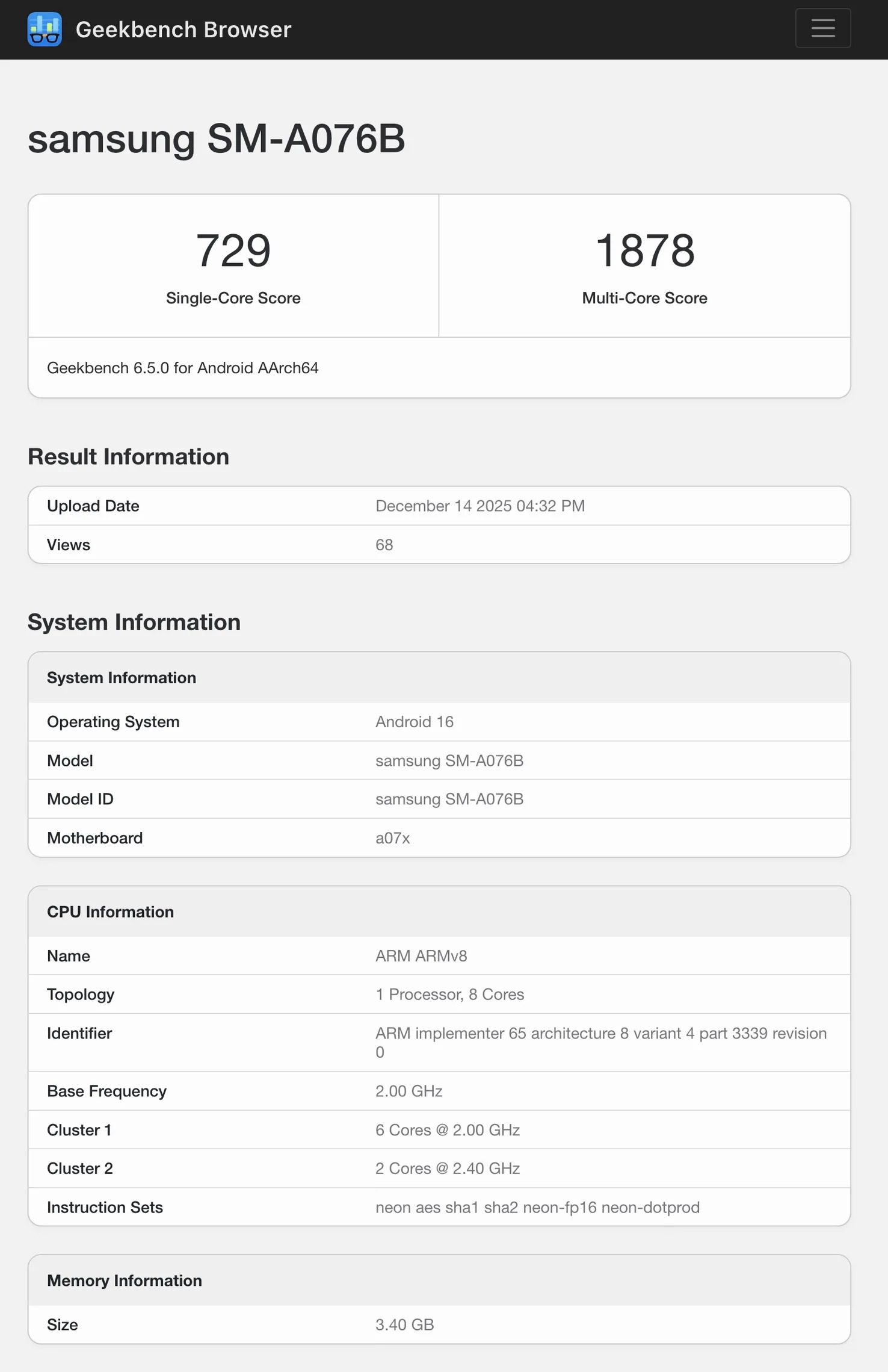 Las filtraciones de Geekbench confirman que el equipo integrará un procesador MediaTek Dimensity 6300 acompañado de 4 GB de memoria RAM. Se espera que existan versiones con 6 GB y 8 GB en mercados seleccionados, siguiendo la estrategia aplicada al Galaxy A07 4G.
