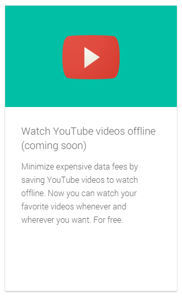 Ahora Google anuncia que en la página para visualizar videos por excelencia, Youtube, se podrán descargar sus videos para ser vistos sin conexión a Internet, la intención es de ahorrar datos debido a su alto costo, sin embargo, se desconoce si el video descargado incluirá alguna encriptación por el tema de los derechos de autor o Copyrights. Cabe destacar que éste es un servicio que sólo estará disponible en la India.
