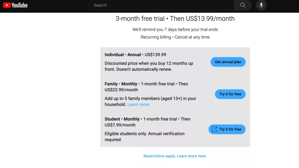 Si tenemos una cuenta de YouTube en Estados Unidos, entonces, vamos a poder ver que en la página web de la compañía el nuevo precio para una suscripción mensual es ahora de USD $13.99, esto es USD $2 más caro que antes.